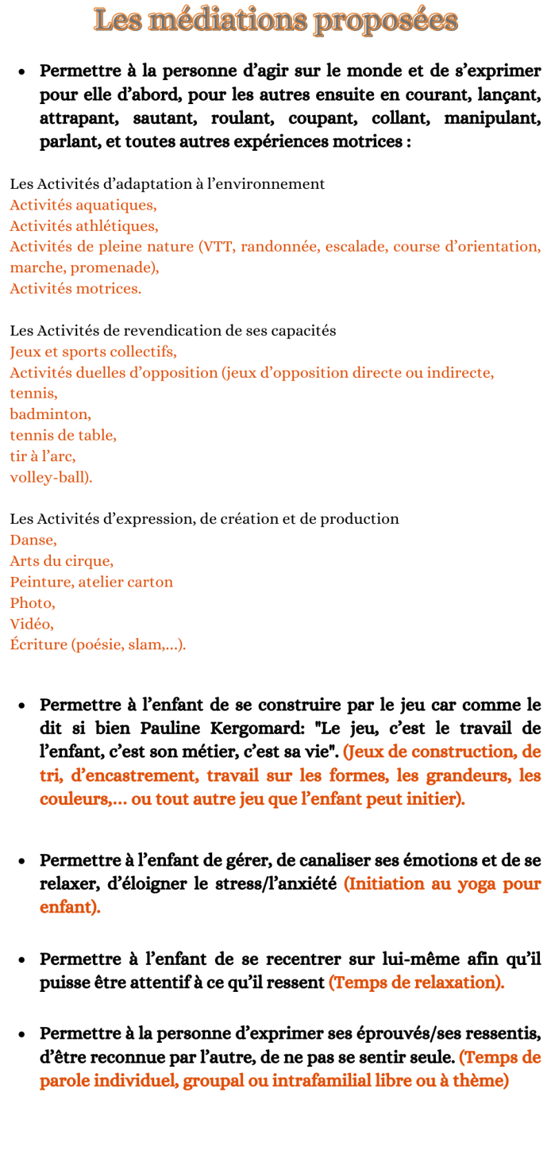 Les médiations ne se restreignent pas à ce qui est proposé ci-dessus. Le plus signifiant est quand elles surgissent de la créativité de la personne accompagnée.